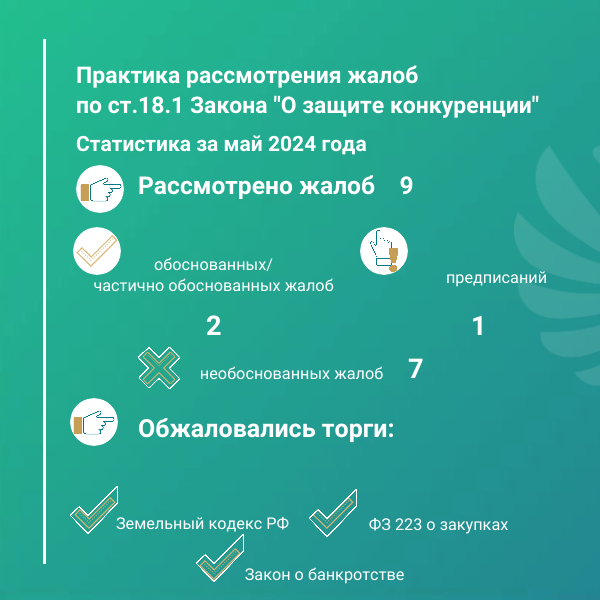 Обзор итогов рассмотрения жалоб по статье 18.1 Закона «О защите конкуренции» за май