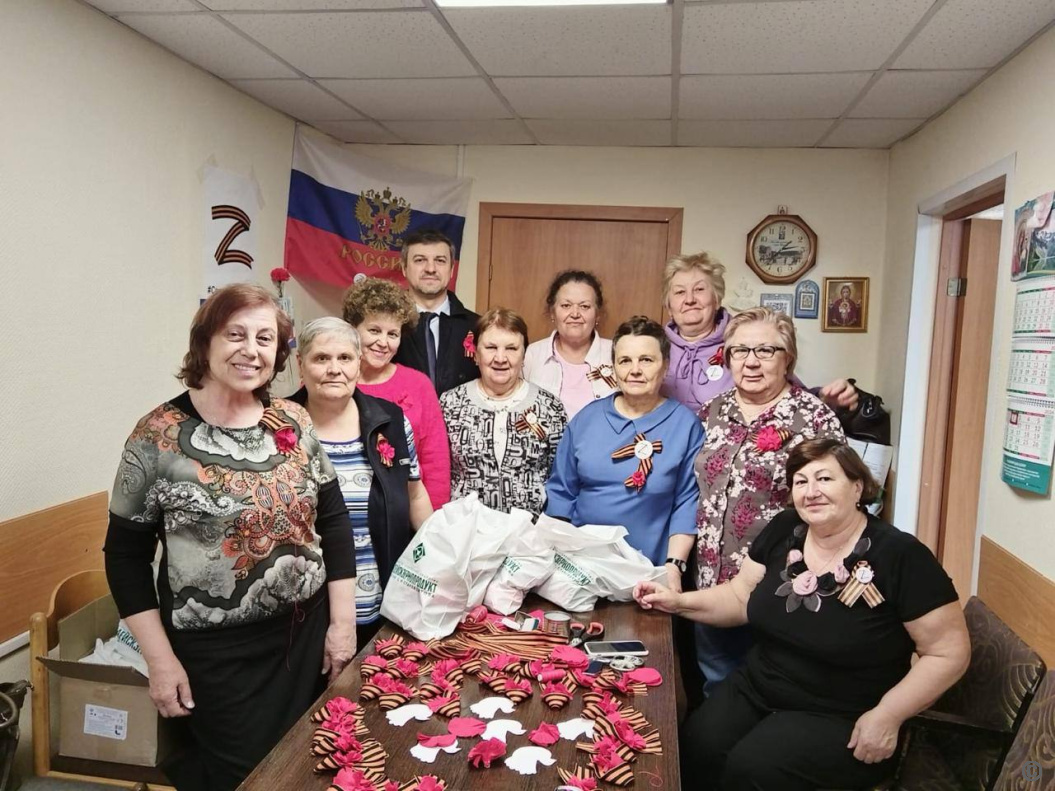 Депутат посетил активистов во время проведения мастер-класса по изготовлению георгиевских лент. Также в ТОСе проводится большая работа по сбору гуманитарной помощи для участников СВО, активисты плетут маскировочные сети и нашлемники.