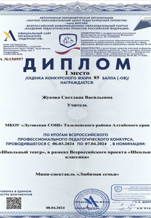 С 6 марта по 7 апреля школьный театр "МИР" принял участие во Всероссийском конкурсе «Школьный театр» в рамках Всероссийского проекта «Школьная классика». Театральная группа Луговской школы представила на суд жюри миниатюру "Любимая семья". Оценивание происходило по следующим критериям: художественная и воспитательная ценность репертуара; исполнительское мастерство (артистичность, эмоциональность, выразительность, техника речи, осмысленность действий); зрелищность (костюмы, реквизит, декорации); степень самостоятельности и творческого личностного подхода; сценарное решение (актуальность и глубина раскрытия темы, оригинальность, нестандартность и новизна). И по итогам – Диплом I степени в копилке достижений!