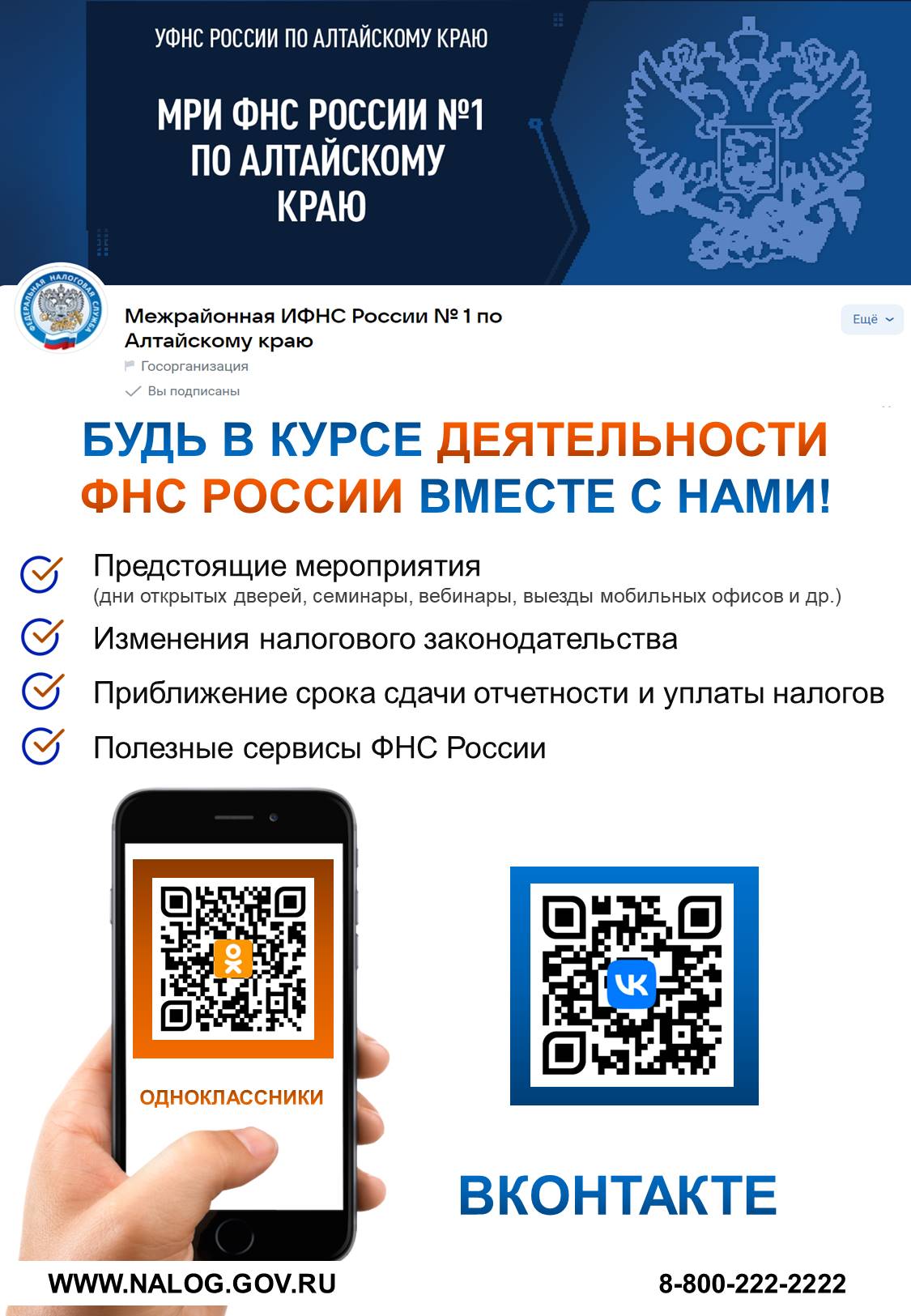 Межрайонная ИФНС России № 1 по Алтайскому краю приглашает граждан подписаться на официальные страницы в социальных сетях «Вконтакте» ( https://m.vk.com/mifns_0122 ) и «Одноклассники» ( https://ok.