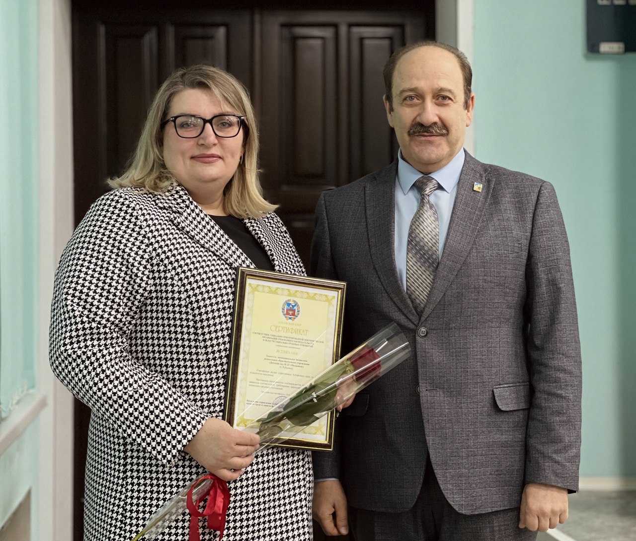 Глава города Дмитрий Фельдман поздравил заведующего детским садом Анастасию Аржанцеву с этим достижением и вручил сертификат соответствия социально ориентированным некоммерческим организациям.