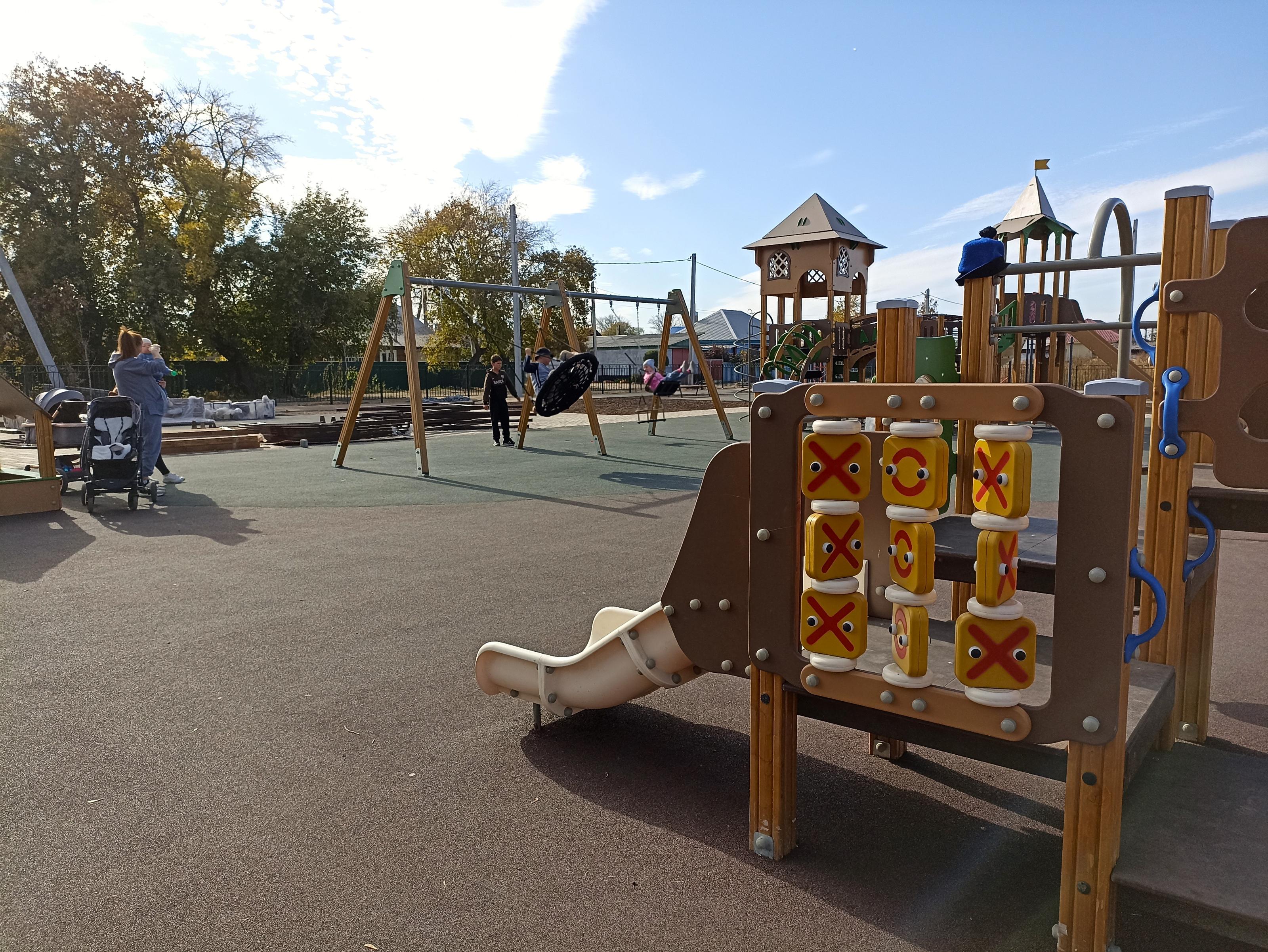 В результате благоустройства на территории появились современные спортивные комплексы, скейт-площадка, тренажерная беседка, песочница и качели. Благоустроена зона отдыха, где можно расположиться на уютных скамейках. Для организации праздничных мероприятий установлена сцена. Территория оснащена системами освещения, видеонаблюдения и ограждения. Дорожки и площадки покрыты асфальтобетонным, плиточным и резино-полимерным покрытием.