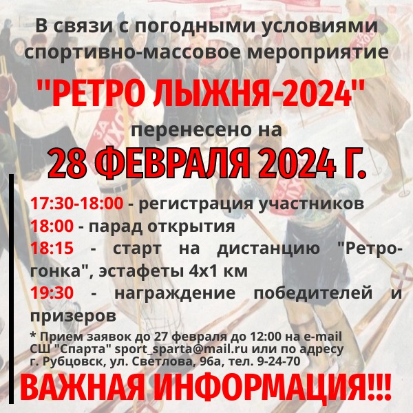 В связи с погодными условиями спортивно-массовое мероприятие «Ретро Лыжня-2024» перенесено на 28 февраля 18:00.