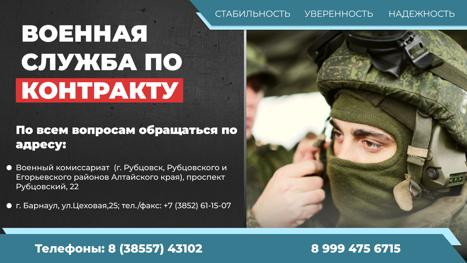 г. Рубцовск, пр-кт Рубцовский, 22; тел.: +7 (38557) 4-47-98; 8 (38557) 43102; 8 999 475 6715 г. Барнаул, ул.Цеховая,25; тел./факс: +7 (3852) 61-15-07Последние новости