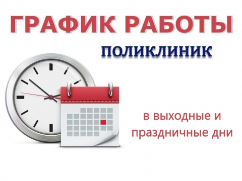 Уважаемые пациенты! В выходные и праздничные дни в период с 28.04.2024 по 01.05.2024 и с 09.05 по 12.05.2024 поликлиники будут работать по следующему графику: